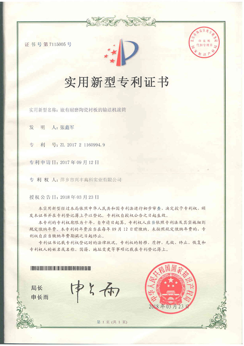 陶瓷襯板專利證書